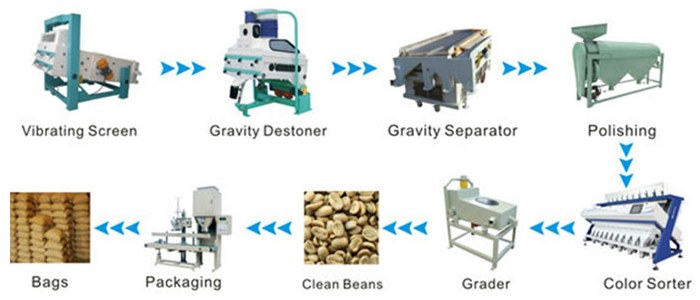 Once selection process removes impurities in the bean; twice polishing processes dedust the materials to increase lustrousness; The vibration sifter grades out brokens in the finished products while the complete fine beans are conveyed to color sorter. The sorted kernels are selected again and then go to packaging cabinet. Finished products go to mechanically packaged through buffering bin.