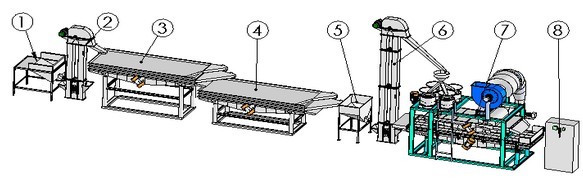 Sizing unit: consists of input hopper, elevator, sizing machines (quantity of sizing machines depends on the raw materials, shown 5 sizes as per our drawing)