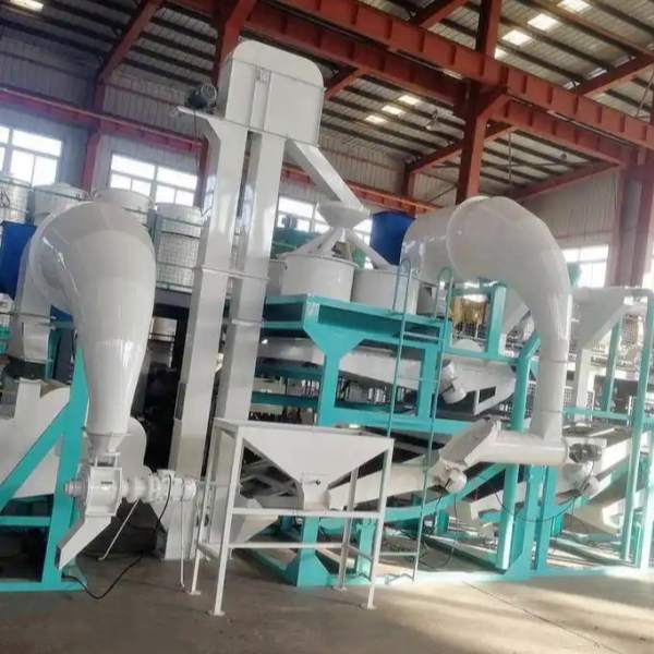 It consists of input hopper ①spiral elevator ②multi-functional cleaner ③bucket elevator ④twin-dehullers ⑤reseparator ⑥(3sets), kernels collector⑦ pneumatic device for back-flowing materials ⑧electric control cabinet ⑨.